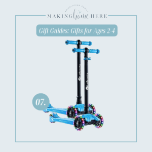 - Scooter– All of our kids started riding scooters at age 2. We’ve tried a couple of different brands, but this one is our fave and the price is much better than the first brand we tried! I also like that this one has a ride on option if needed early on.