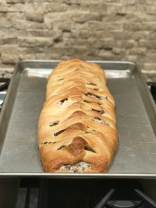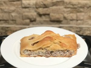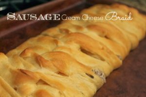 Lay sausage mixture down the center of the crescent rolls. Starting from the top, pull up two sides of the crescent rolls, twist, and lay in the center. Bake for 14-18 minutes, or until golden brown.
